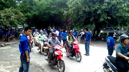 | Sinh viên tình nguyện học viện tham gia phân luồng giao thông. |