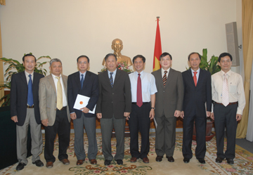 | Phó Thủ tướng, Bộ trưởng Ngoại giao Phạm Gia Khiêm và Thứ trưởng Bùi Thanh Sơn chụp ảnh lưu niệm với các đồng chí mới được bổ nhiệm. |