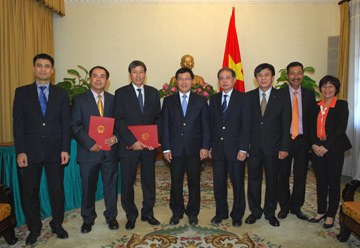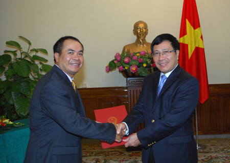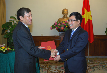 | Phó Thủ tướng, Bộ trưởng Ngoại giao Phạm Bình Minh trao Quyết định bổ nhiệm cho ông Nguyễn Thanh Tân. |