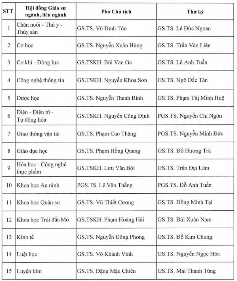 Danh sách Phó chủ tịch và Thư ký cho 28 Hội đồng giáo sư mới được bổ nhiệm cụ thể như sau:
