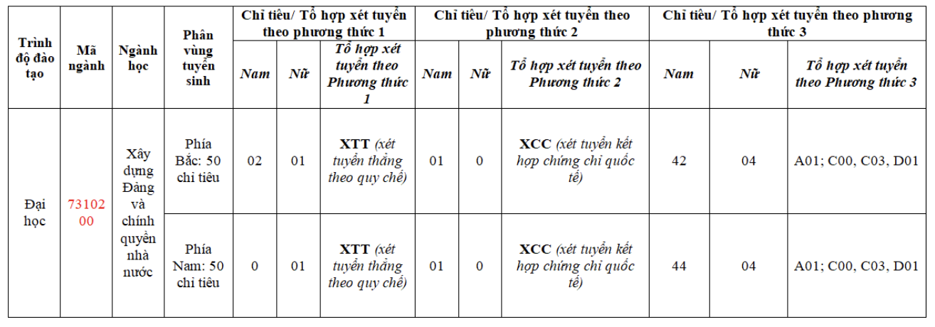 Theo Học viện này, chỉ tiêu nêu trên được điều chỉnh căn cứ từ chỉ tiêu chưa tuyển đủ theo phương thức 1 (tuyển thẳng theo quy chế tuyển sinh hiện hành của Bộ Giáo dục và Đào tạo (GD&ĐT)) và phương thức 2 (xét tuyển kết hợp chứng chỉ quốc tế với kết quả học tập THPT) được nêu trong đề án tuyển sinh của Học viện.