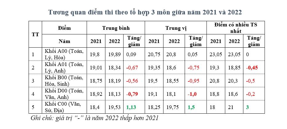 Ở chiều ngược lại, TS Phương nhận xét các tổ hợp các tuyển khác như A01 (Toán, Lý, Anh), B00 (Toán, Hóa, Sinh) và D00 (Toán, Văn, Anh) giảm so với năm 2021 dao động từ 0,5 đến 1 điểm do ảnh hưởng bởi điểm môn Sinh và Tiếng Anh.