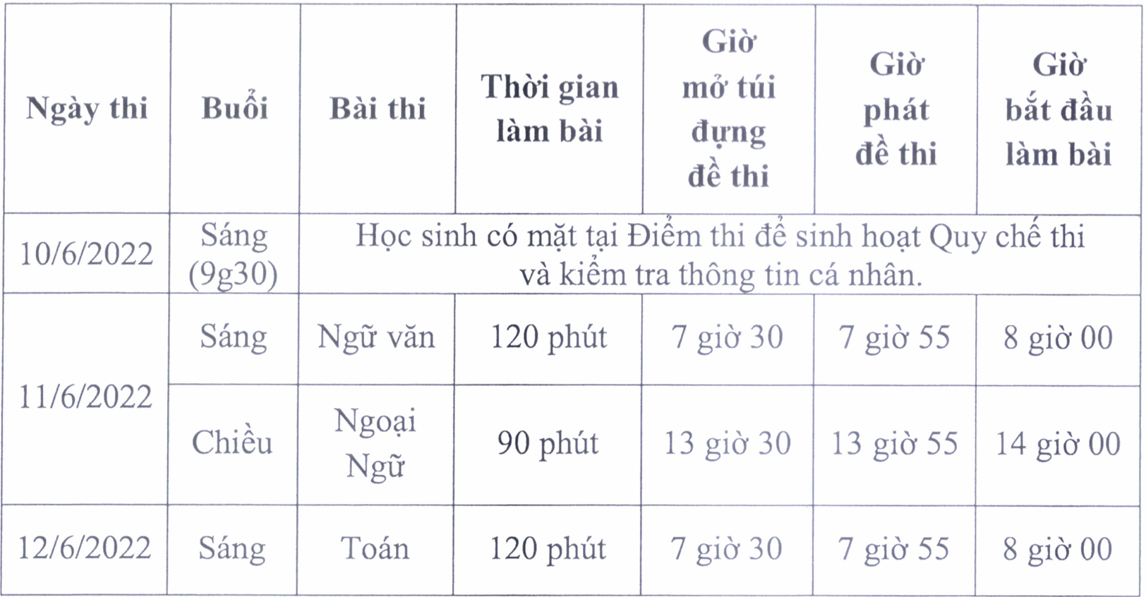 Thời gian thi cụ thể như sau: