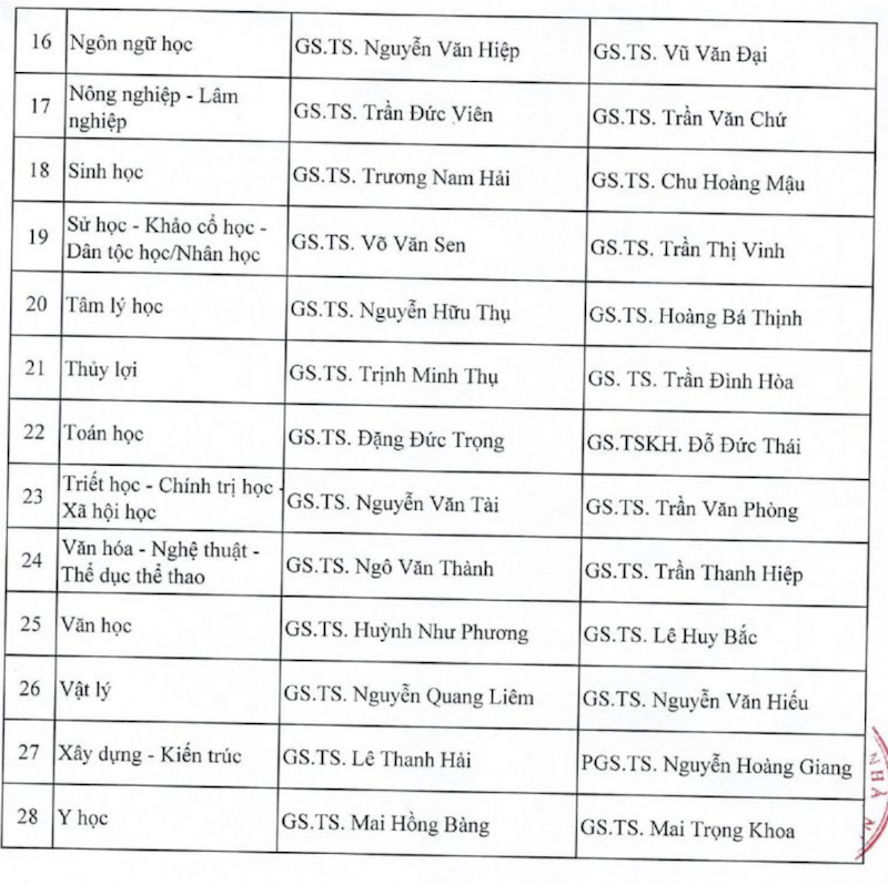 Danh sách Phó chủ tịch và Thư ký cho 28 Hội đồng giáo sư mới được bổ nhiệm cụ thể như sau: