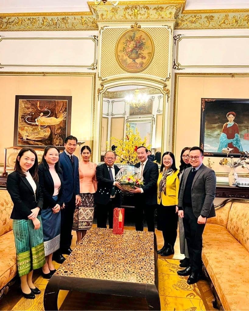 | Đoàn Đại sứ quán Lào tại Bỉ do Đại sứ và Phu nhân dẫn đầu đến chúc mừng Tết cổ truyền Việt Nam. |