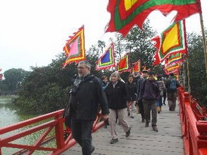 | Khách du lịch nước ngoài thăm Đền Ngọc Sơn ngày mùng 3 Tết. (Ảnh: Bích Ngọc/TTXVN) |