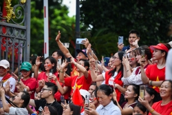 | Người dân hai bên đường cổ vũ các chiến sĩ. (Ảnh: Nguyễn Hồng) |