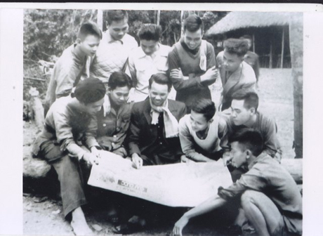 | Xuân Thủy - người quàng khăn ngồi giữa khi làm báo Cứu quốc trên Việt Bắc. |
