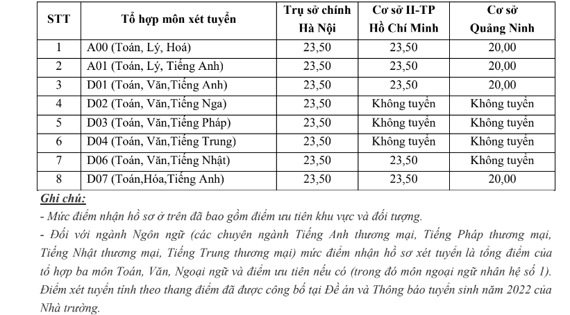 Tại cơ sở II TP. Hồ Chí Minh nhận hồ sơ xét tuyển năm tổ hợp: A00, A01, D01, D06, D07, thí sinh cũng phải đạt tối thiểu 23,50 điểm mới đủ điều kiện xét tuyển. Riêng bốn tổ hợp: A00, A01, D01, D07 tại cơ sở Quảng Ninh, thí sinh cần đạt tối thiểu 20 điểm để đủ điều kiện xét tuyển.