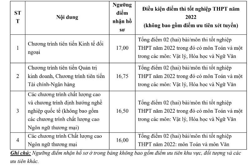 Năm 2022, Chương trình tiên tiến Kinh tế Đối ngoại của Đại học Ngoại thương có ngưỡng điểm sàn cao nhất để nhận hồ sơ xét tuyển là 17 điểm. Các chương trình Chất lượng cao Ngôn ngữ thương mại có điểm sàn phương thức 3 thấp nhất là 16 điểm và bắt buộc yêu cầu kết quả 2 bài thi là Toán và Văn.